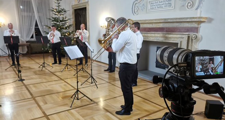 Die Pandemie bestimmt auch 2021 das vorweihnachtliche Konzertgeschehen. Viele Adventskonzerte und Auftritte bei Weihnachtsmärkten und -feiern mussten kurzerhand abgesagt werden. Dies trifft insbesondere den Amateurbereich, da die Programme oftmals bereits eingeübt waren und nun nicht vorgetragen werden können. Zumindest nicht vor anwesendem Publikum. Mit Unterstützung des Landkreises und der Stadt Ravensburg, TAVIR e.V. und der Stadt Kißlegg hat die diestreamerei.de eine Alternative angeboten: an vier Tagen hat ein gutes Dutzend Ensembles Musik- und Wortbeiträge im Bankettsaal im Neuen Schloss Kißlegg aufgezeichnet.