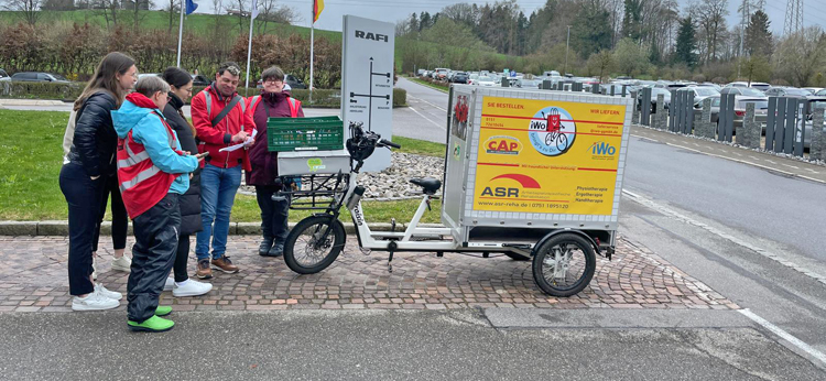Mitarbeiter der IWO präsentieren ihren Lieferservice „IWO Bringt´s“ den Azubis bei RAFI in Berg. Bild: IWO