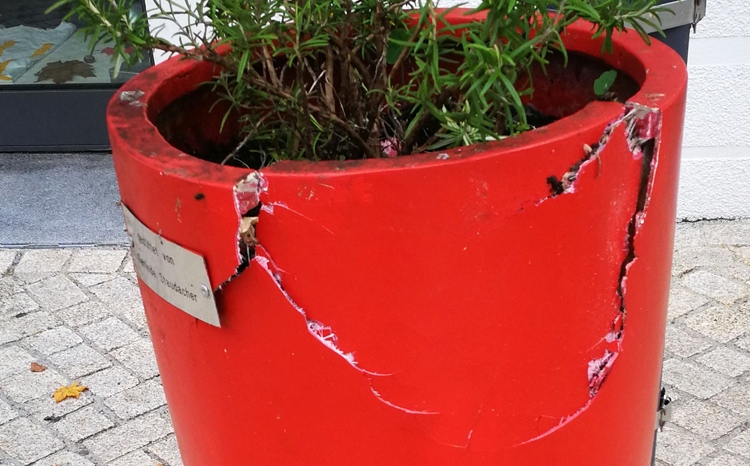 Der Weingartener Kräutergarten mit seinen 20 roten Pflanzkübeln in der Fußgängerzone ist seit seiner Eröffnung 2019 nicht nur zum Hingucker im Stadtbild geworden, sondern wird auch sehr gut angenommen. Leider ist einer der Töpfe in den vergangenen Tagen so stark beschädigt worden, dass er abgebaut werden musste. Der Kübel war am Eingang der Fußgängerzone auf Höhe des Geschäfts Outfit Trend an einer Laterne befestigt. Der Vorfall ereignete sich wahrscheinlich am Markttag, Mittwoch, 4. November. Zeuginnen und Zeugen, die in dieser Zeit etwas beobachtet haben, können sich mit ihren Hinweisen bei der ehrenamtlichen Gruppe unter der Mailadresse lebendigesweingarten@web.de oder telefonisch bei der Fachstelle für Bürgerschaftliches Engagement der Stadt Weingarten unter der Nummer 0751 / 405-107 melden.