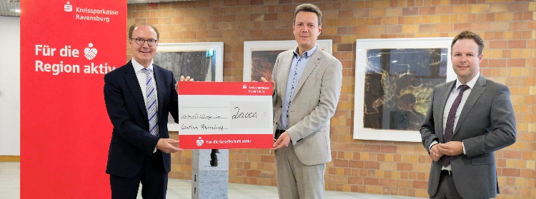 Heinz Pumpmeier (l.), Vorstandsvorsitzender und Dr. Patrick Kuchelmeister (r.), stv. Vorsitzender des Vorstands der Kreissparkasse Ravensburg, übergeben den Scheck in Höhe von 20.000 Euro an Landrat Harald Sievers (m.). Bild: KSK Ravensburg