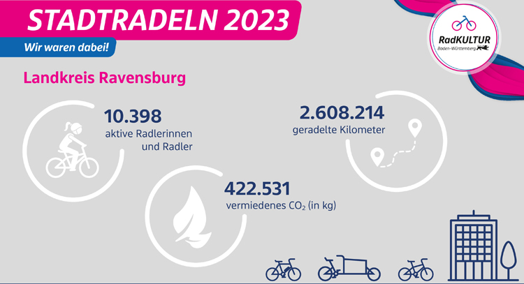 Alle Informationen zur Aktion und die Ergebnisse sind unter https://www.stadtradeln.de/landkreis-ravensburg/ veröffentlicht. Im Rahmen der Initiative RadKULTUR des Verkehrsministeriums Baden-Württemberg fördert das Land die Teilnahme an der Aktion.