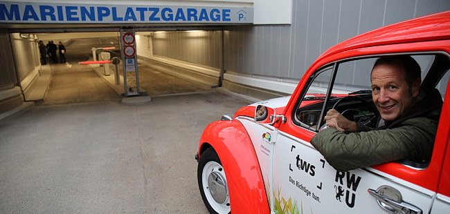 Nach rund zwei Jahren grundlegender Sanierung öffnete am Freitagmorgen die Marienplatz Tiefgarage P1 wieder ihre Schranken. Oberbürgermeister Dr. Daniel Rapp durfte mit einem Elektro-Käfer der TWS um 8.30 Uhr das erste Parkticket ziehen.