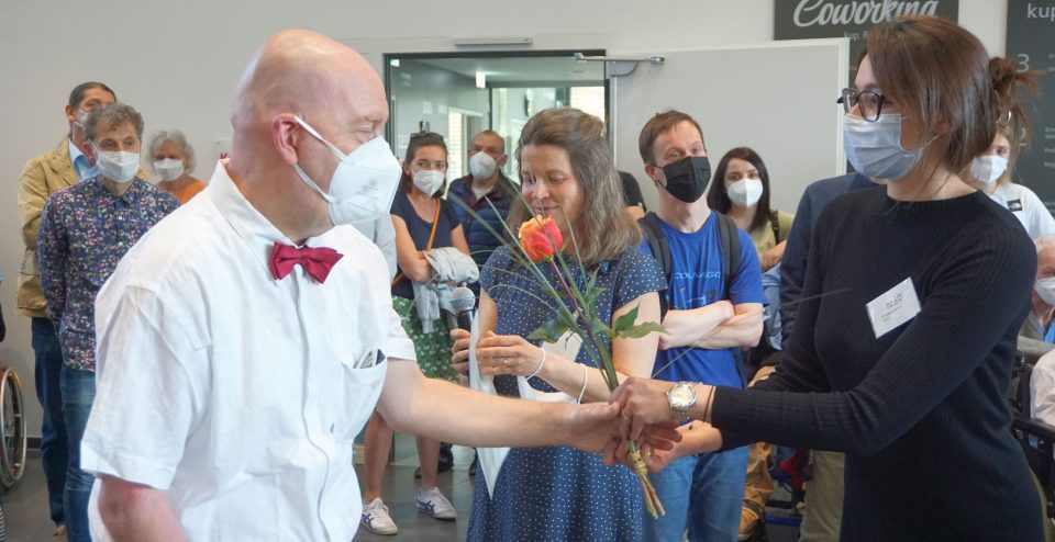 Dies ist das Motto des diesjährigen Aktionstags zur Gleichstellung der Menschen mit Behinderungen. Jörg Munk, Geschäftsführer der Liebenau Teilhabe, wies in seiner Begrüßungsrede darauf hin, dass „die Mitarbeitenden der Stiftung Liebenau tagtäglich ihren Beitrag zur Inklusion leisten“ und freut sich, dass diese Ausstellung mitten im KUP zu sehen ist. „Zu einem guten Leben gehört mehr als nur reines Nützlichkeitsdenken. Denn auch das sinnliche Erleben und die Kunst sind wichtiger Bestandteil für alle Menschen.“