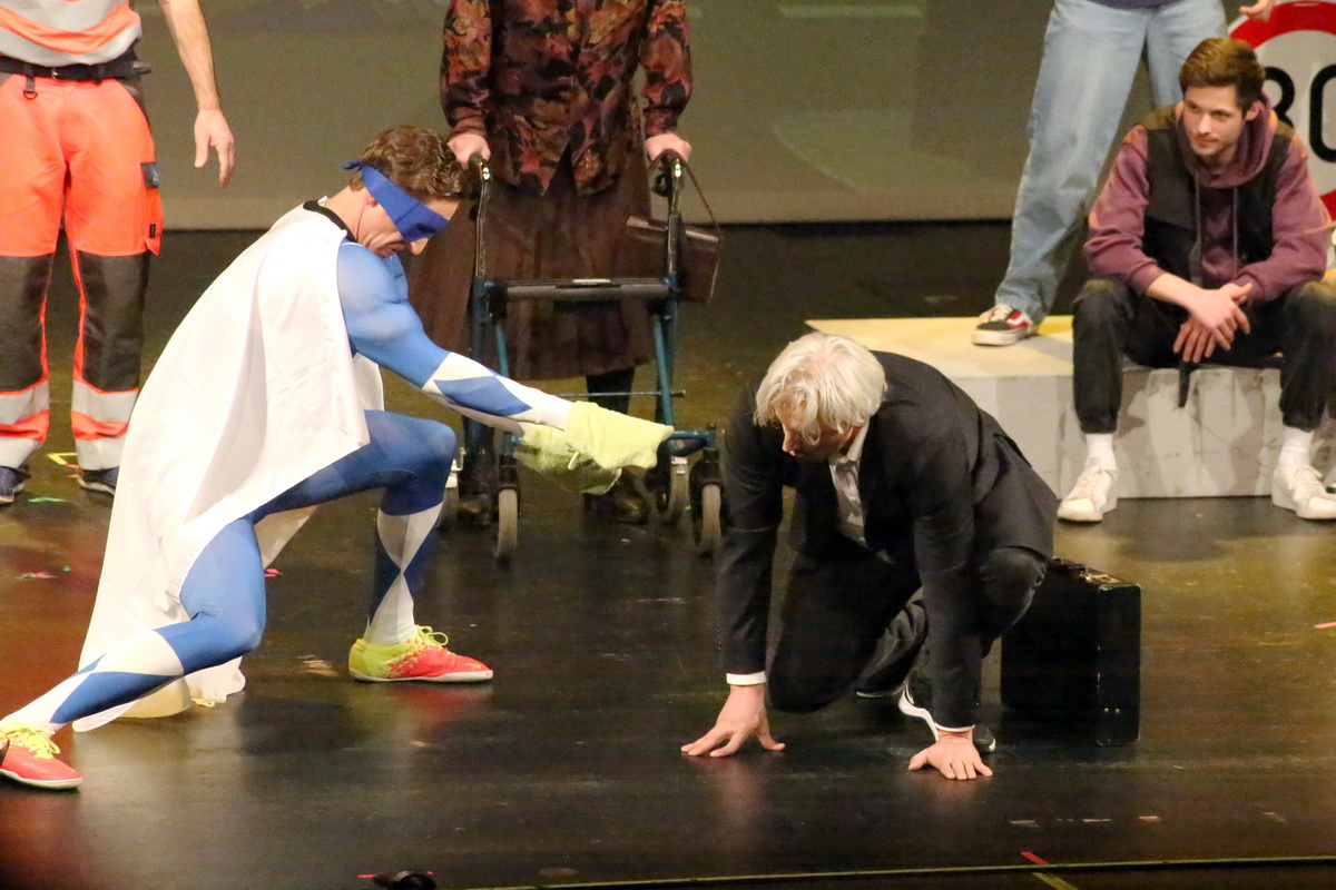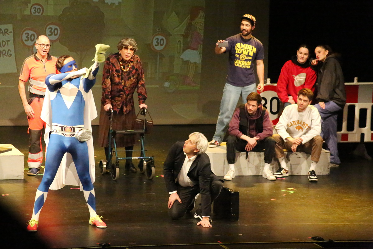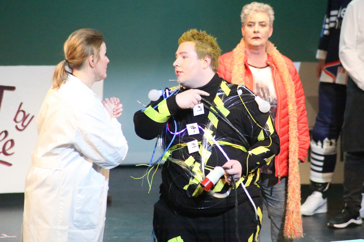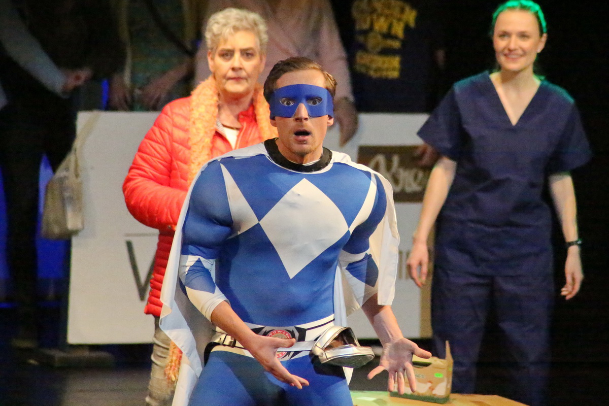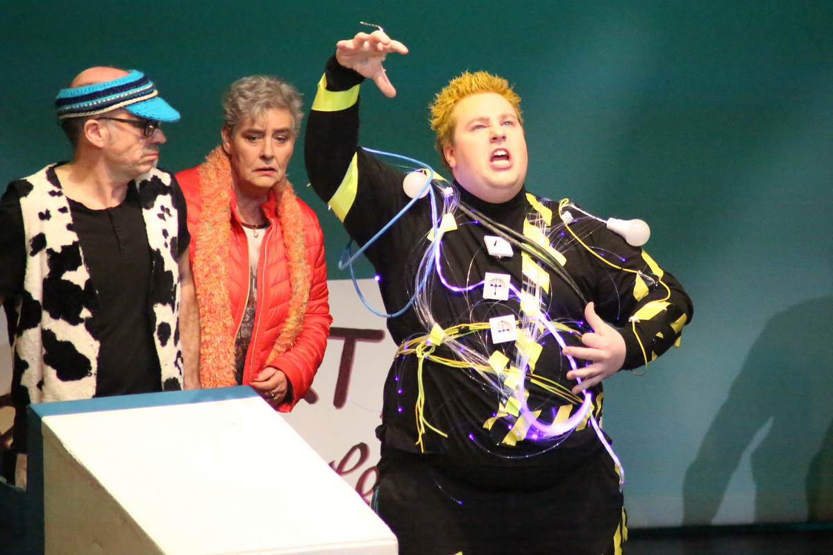 Die Aufgaben des Ravensburger Superhelden sind ganz schön knifflig, denn er bekommt es mit einem richtig fiesen Schurken zu tun. Der “BÄM” war bis zu seiner spektakulären Verwandlung ein vermeintlich normaler Ravens-Bürger, der bei einem Bärengartenbesuch auf unglückliche Art ins Koma gefallen ist und im EK wieder aufgeweckt werden soll. Dort überlässt die ratlose Oberärztin Dr. Ingeborg Immenhof (gespielt von Michaela Püllen) den armen Kerl dem Leiharbeiter Schorsch Schräuble (alisas Tobias Gerstung) – eigentlich ein KFZ-Mechaniker. Da der Oberschwabenklinik beim ganzen Geschäftsführer-Theater reihenweise das Personal weggelaufen ist, werden jetzt unorthodoxe Wege gefahren, um den Personalbedarf zu decken. Der PS- und motorbegeisterte KFZ-Schrauber setzt die Stromstärke aber viel zu hoch an und schon nimmt das Unheil seinen Lauf. “BÄM” versetzt die Stadt mit seinen wenig nachhaltigen Zielen und nicht zuletzt mit einem markerschütternden “Humba, Humba” in Angst und Schrecken. Obwohl: Bei BÄMs Ankündigung, auf dem Marienplatz Tempo 100 einzuführen, gibt es tosenden Applaus des Publikums.