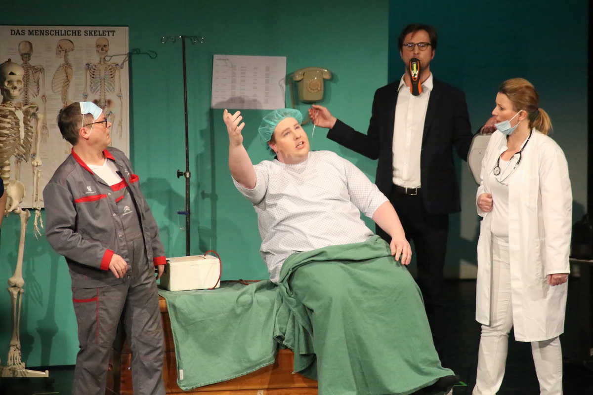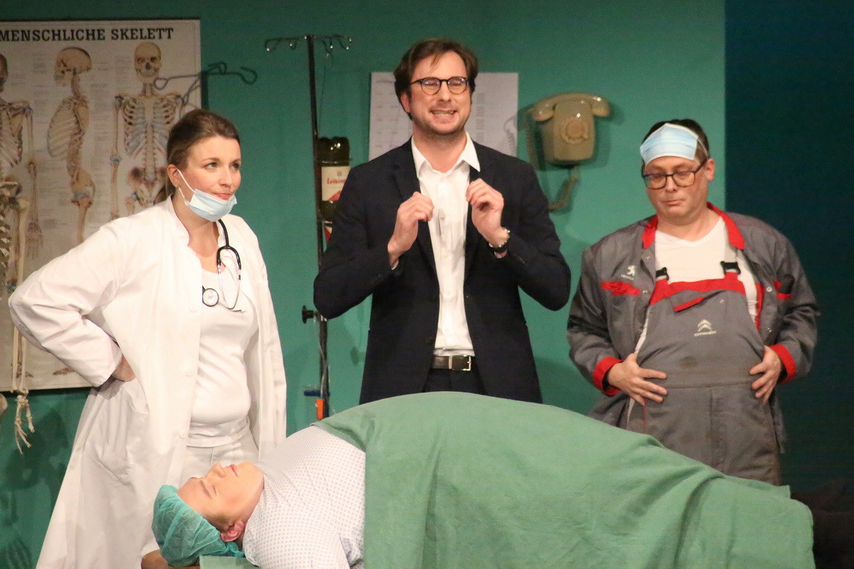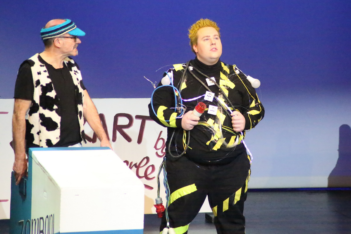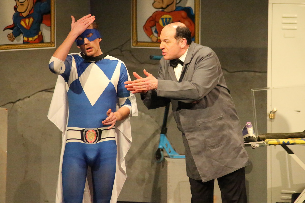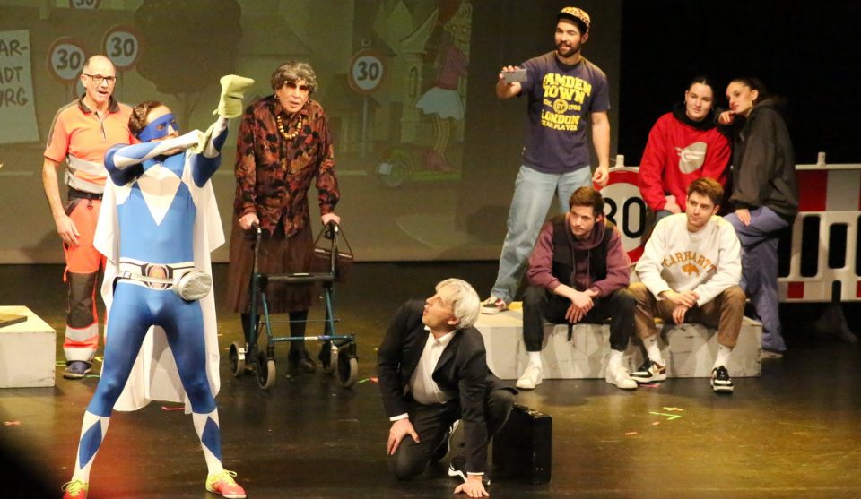 Die Aufgaben des Ravensburger Superhelden sind ganz schön knifflig, denn er bekommt es mit einem richtig fiesen Schurken zu tun. Der “BÄM” war bis zu seiner spektakulären Verwandlung ein vermeintlich normaler Ravens-Bürger, der bei einem Bärengartenbesuch auf unglückliche Art ins Koma gefallen ist und im EK wieder aufgeweckt werden soll. Dort überlässt die ratlose Oberärztin Dr. Ingeborg Immenhof (gespielt von Michaela Püllen) den armen Kerl dem Leiharbeiter Schorsch Schräuble (alisas Tobias Gerstung) – eigentlich ein KFZ-Mechaniker. Da der Oberschwabenklinik beim ganzen Geschäftsführer-Theater reihenweise das Personal weggelaufen ist, werden jetzt unorthodoxe Wege gefahren, um den Personalbedarf zu decken. Der PS- und motorbegeisterte KFZ-Schrauber setzt die Stromstärke aber viel zu hoch an und schon nimmt das Unheil seinen Lauf. “BÄM” versetzt die Stadt mit seinen wenig nachhaltigen Zielen und nicht zuletzt mit einem markerschütternden “Humba, Humba” in Angst und Schrecken. Obwohl: Bei BÄMs Ankündigung, auf dem Marienplatz Tempo 100 einzuführen, gibt es tosenden Applaus des Publikums.