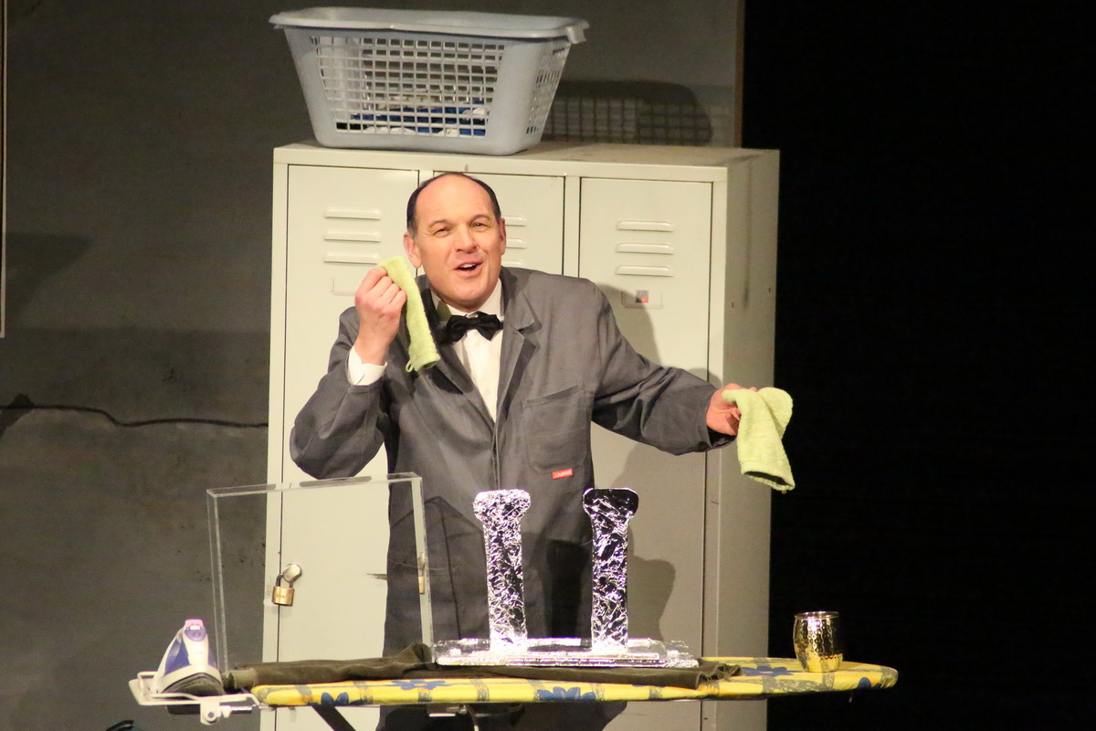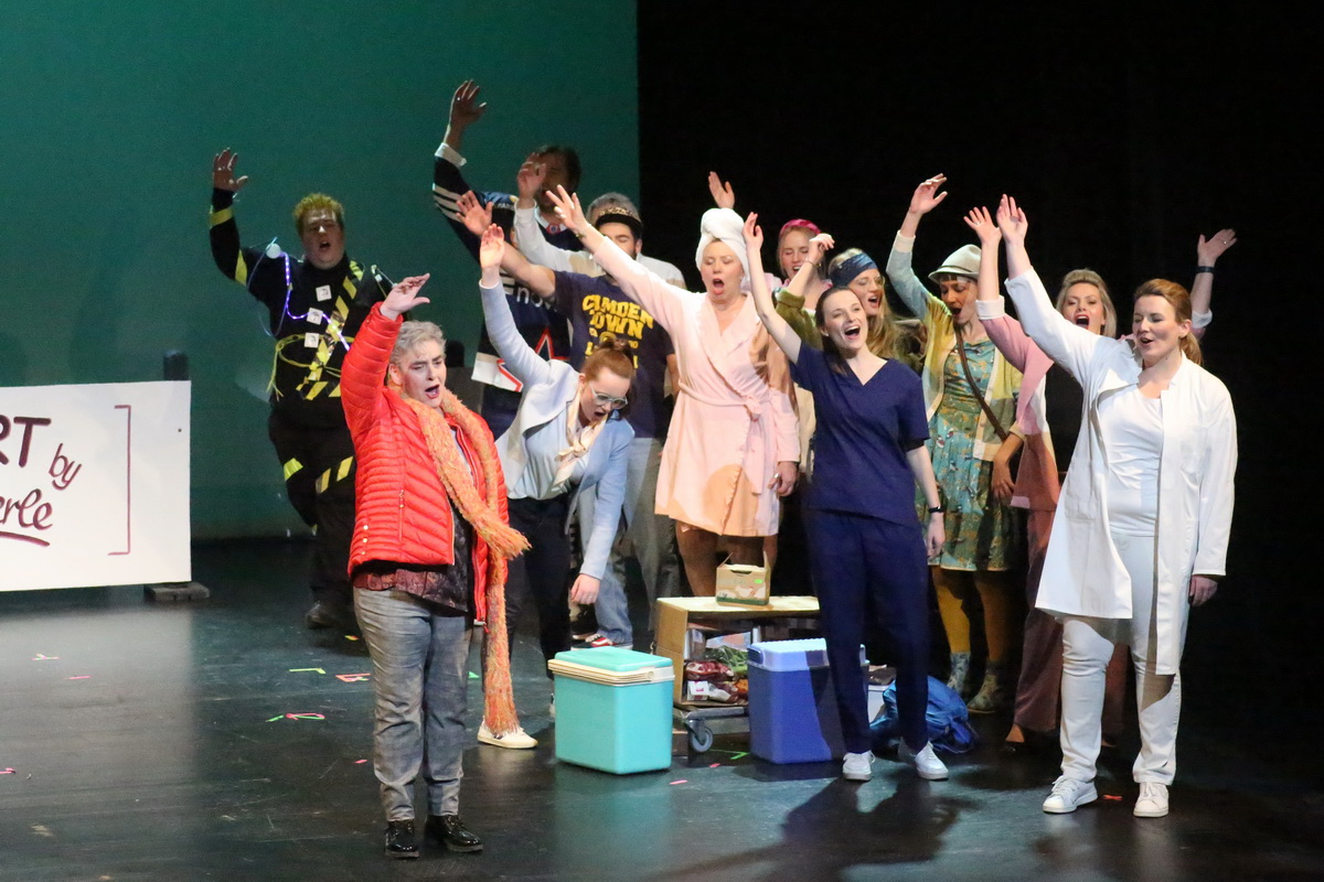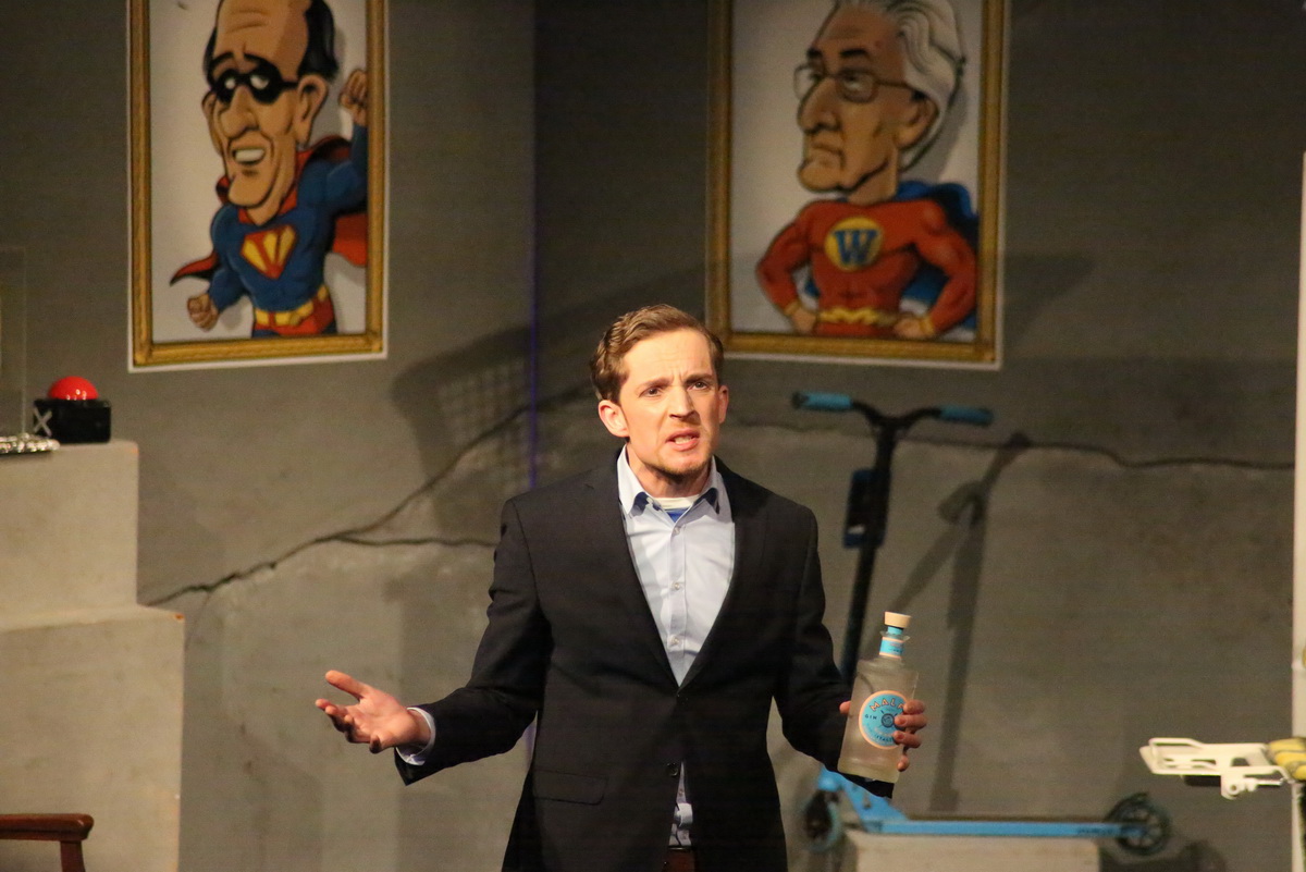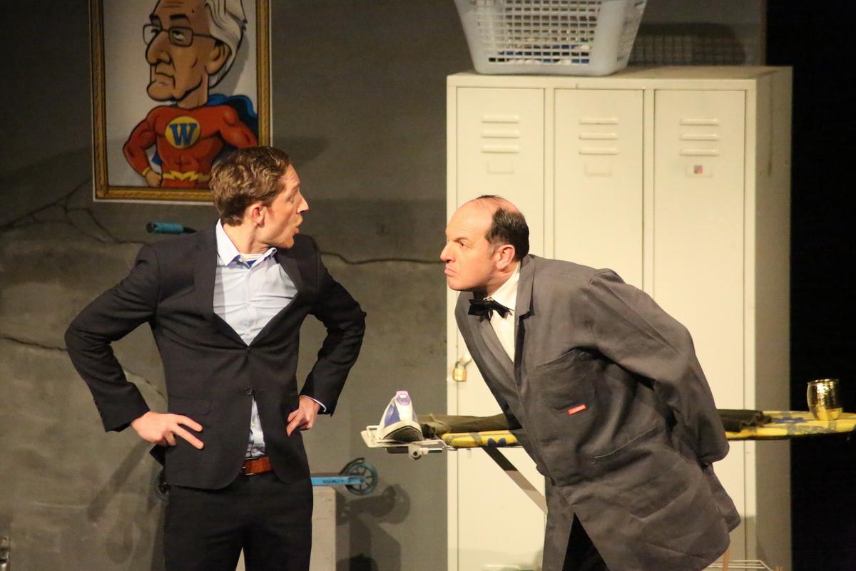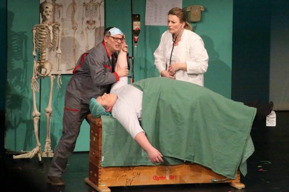Die Aufgaben des Ravensburger Superhelden sind ganz schön knifflig, denn er bekommt es mit einem richtig fiesen Schurken zu tun. Der “BÄM” war bis zu seiner spektakulären Verwandlung ein vermeintlich normaler Ravens-Bürger, der bei einem Bärengartenbesuch auf unglückliche Art ins Koma gefallen ist und im EK wieder aufgeweckt werden soll. Dort überlässt die ratlose Oberärztin Dr. Ingeborg Immenhof (gespielt von Michaela Püllen) den armen Kerl dem Leiharbeiter Schorsch Schräuble (alisas Tobias Gerstung) – eigentlich ein KFZ-Mechaniker. Da der Oberschwabenklinik beim ganzen Geschäftsführer-Theater reihenweise das Personal weggelaufen ist, werden jetzt unorthodoxe Wege gefahren, um den Personalbedarf zu decken. Der PS- und motorbegeisterte KFZ-Schrauber setzt die Stromstärke aber viel zu hoch an und schon nimmt das Unheil seinen Lauf. “BÄM” versetzt die Stadt mit seinen wenig nachhaltigen Zielen und nicht zuletzt mit einem markerschütternden “Humba, Humba” in Angst und Schrecken. Obwohl: Bei BÄMs Ankündigung, auf dem Marienplatz Tempo 100 einzuführen, gibt es tosenden Applaus des Publikums.