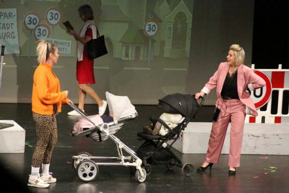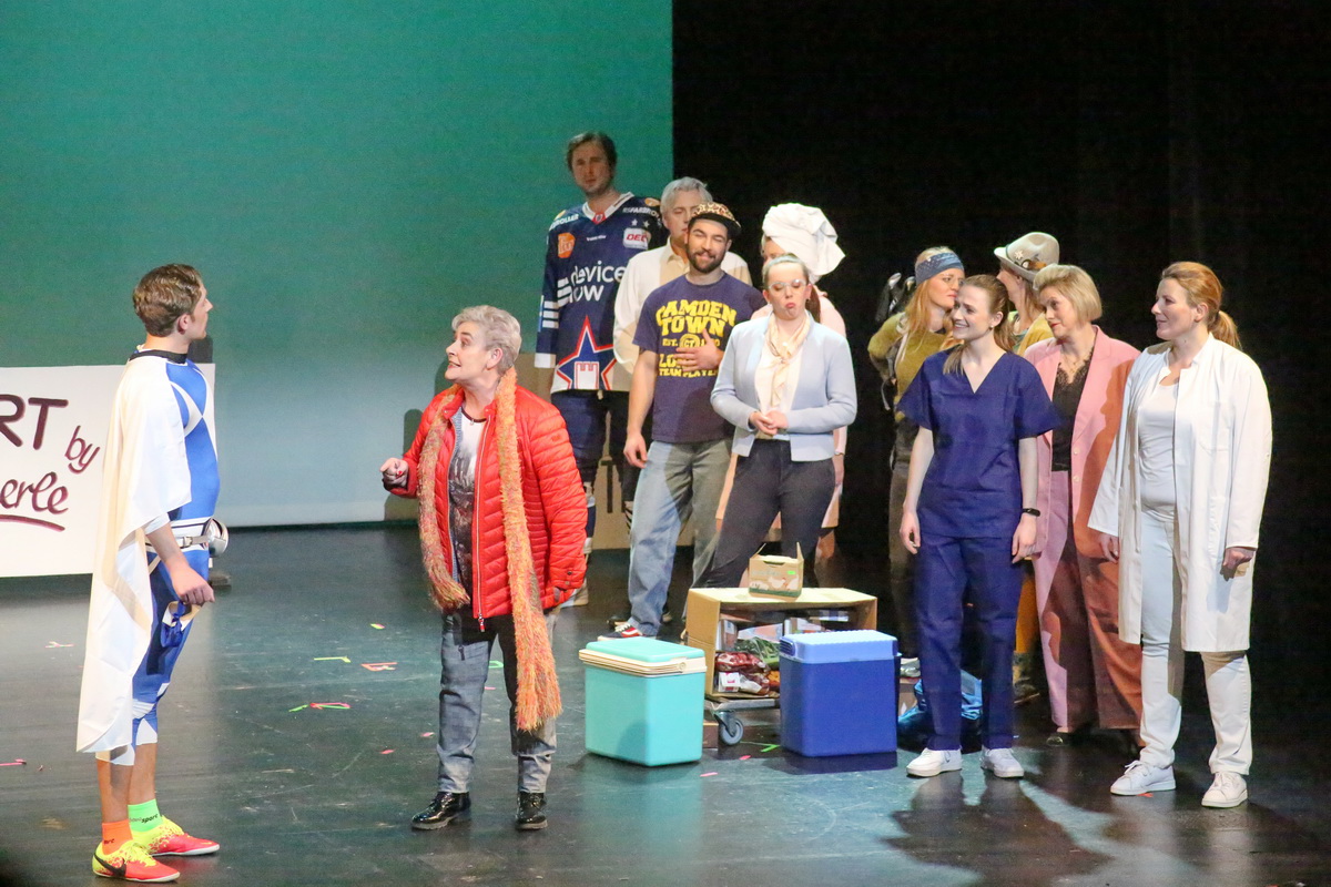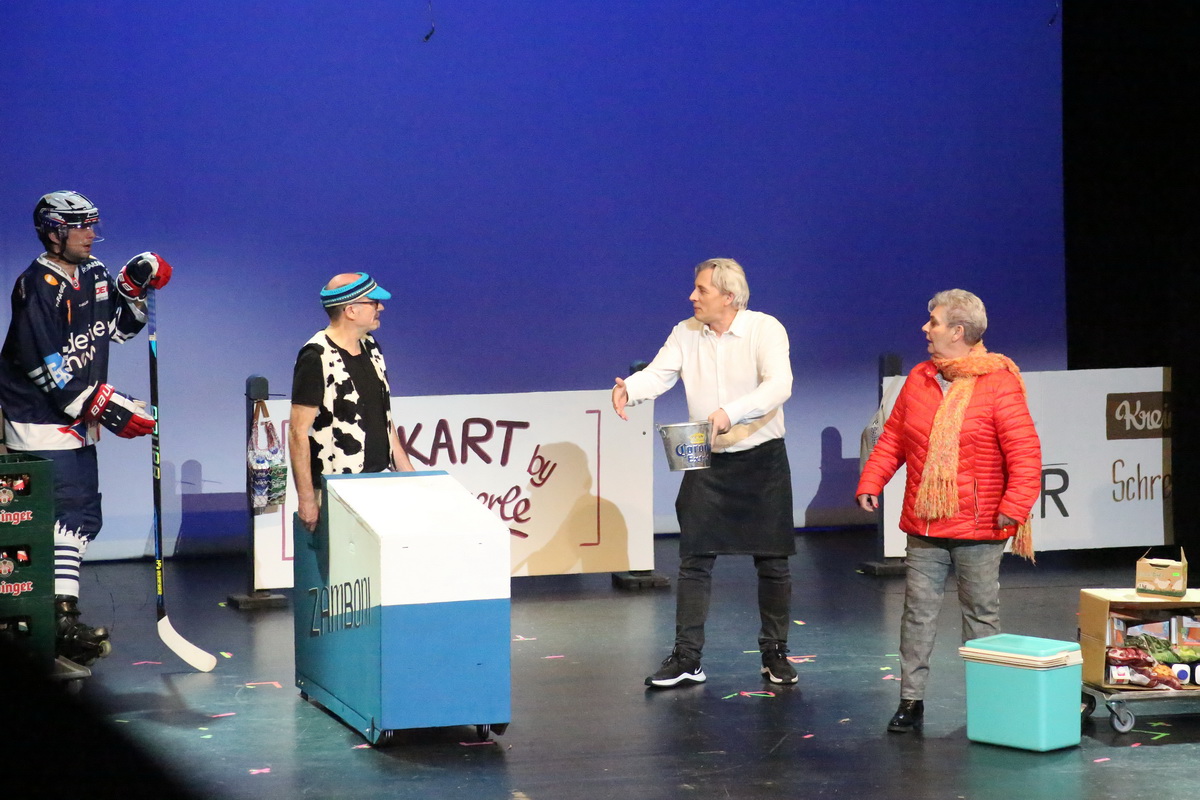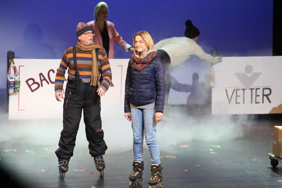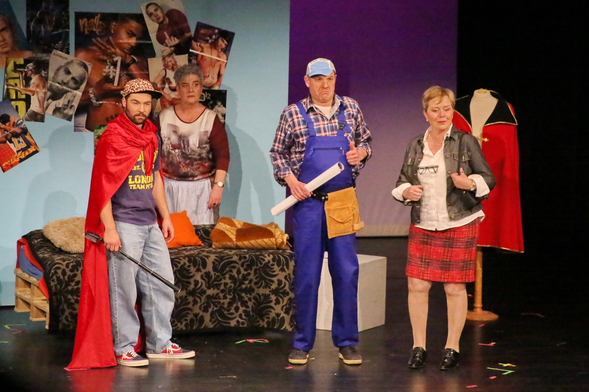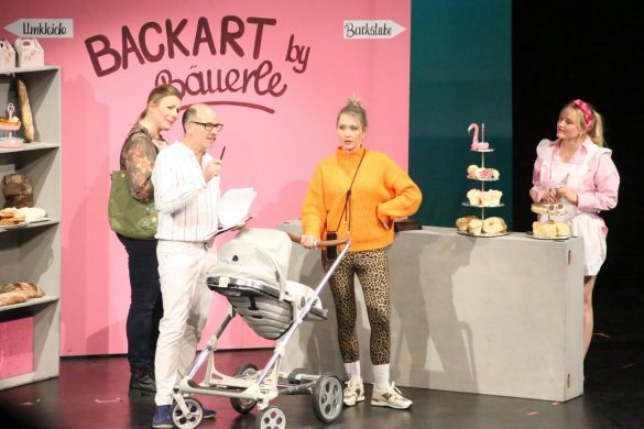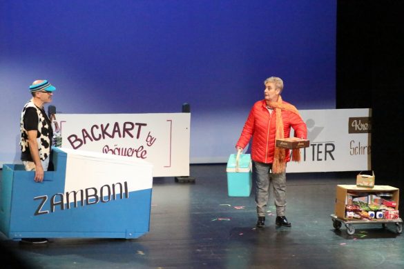 Wie jede Superhelden-Geschichte hat die Milka-Auflage so den einen oder anderen Nebenschauplatz – bei dem sich die erwartungsfrohen Konzerthaus-Besucher eine Lachmuskel-Entzündung einhandelten. Wäre da zum Beispiel der gnadenlose Überbietungskampf um vermeintliche Fachkräfte. Weder Lisbeth und Siegfried Kreidler von der gleichnamigen Schreinerei (gespielt von Brigitte Pfaff und Christoph Stehle) noch Marry Vetter – die äußerst adrette und englisch-sprach-gewandte Personal-Rekruterin eines ortsansässigen Pharmaunternehmens (gespielt von Daniela Engelberger) – können Möchtegern-Influencer Jason Bächle nicht einmal mit einer 8-Stunden-Woche und Monstergehalt vom Sofa locken.