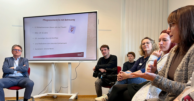 Dabei traf Lucha die ersten Teilnehmerinnen der neuen Maßnahme „Pflegassistent/-in mit Betreuung“, die auf eine gemeinsame Initiative des Jobcenters und der Agentur für Arbeit zurückgeht und aktuell zwölf Quereinsteigerinnen für Basistätigkeiten in der Pflege qualifiziert – ein Erfolgsmodell, das künftig womöglich stärker modular aufgebaut wird, um die Ausbildungsinhalte noch passgenauer und individueller zuschneiden zu können.