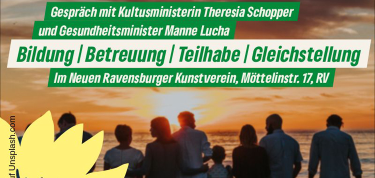 Kultusministerin Theresa Schopper besucht am Montag, 06.05.2024 auf Einladung von Minister Manne Lucha MdL Ravensburg. Der Kreisverband Ravensburg lädt ganz herzlich um 19:00 Uhr zu der Veranstaltung „Bildung | Betreuung | Teilhabe | Gleichstellung“ in den neuen Ravensburger Kunstverein, NRKV, Möttelinstr. 17, Ravensburg ein.