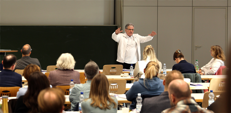 Die Tagung begann mit einem herzlichen Empfang durch Vertreter*innen der RWU. In seinem Grußwort betonte Rektor Professor Dr. Thomas Spägele die zentrale Bedeutung der Pflege und deren Verbesserungsbedarf in Deutschland, um mit der internationalen Entwicklung Schritt zu halten. Anschließend richtete Professorin Dr. Anja Klimsa, Dekanin der Fakultät S, den Blick auf die Finanzierung akademischer Pflege. Diese muss sichergestellt sein, denn akademisiertes Pflegepersonal ist ein entscheidender Faktor, um die pflegerische Versorgung nachhaltig weiterzuentwickeln.