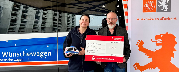 Der Personalratsvorsitzende der Landkreisverwaltung Ravensburg, Uwe Fischer, übergab an zwei Mitarbeitende des Wünschewagens eine Spende in Höhe von 1.900 €. Die Spenden wurden im Rahmen eines Jubiläumsfests für alle Mitarbeitenden der Landkreisverwaltung gesammelt.