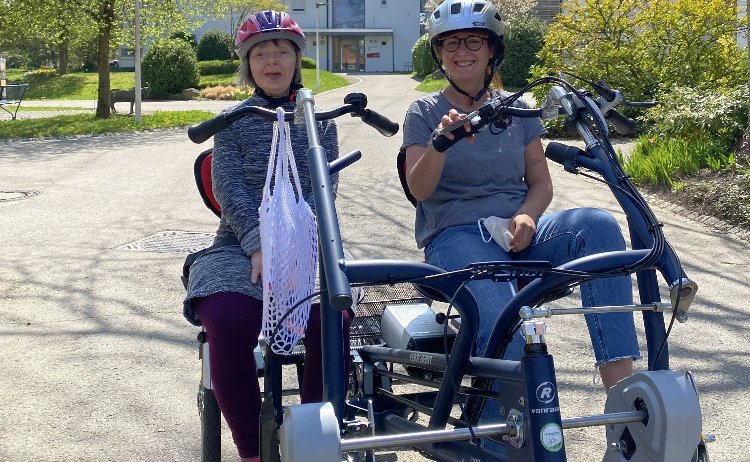 Nebeneinandersitzen und die Radtour genießen: Das neue Dreirad-Pedelec macht’s möglich. Bild: Stiftung Liebenau