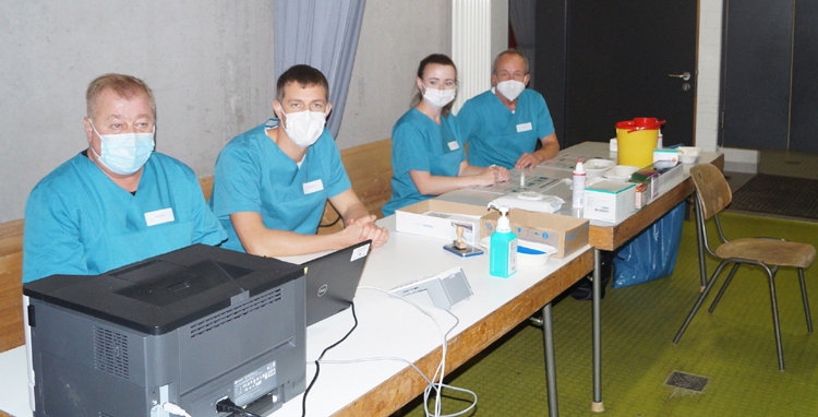 Das mobile Impfteam mit (von links) Bernd Overbeck, Christian Bretzel, Elena Grund und Werner Klinger hat seine Station in einer der Umkleidekabinen der CHG-Arena aufgebaut. Bild:OSK