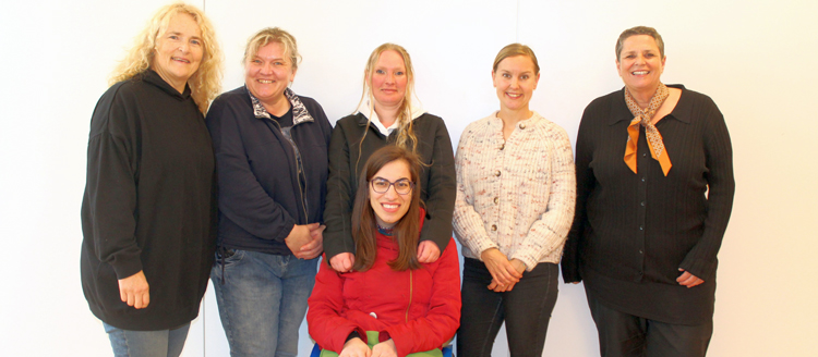 Die Frauenbeauftragten der Liebenauer Arbeitswelten mit den Referentinnen: (v.l.) Brigitte Harsch, Susanne Steegmaier, Stefanie Bernecker (stehend), Carola Sortino, Leontine Hollah und Veronika Wäscher. Bild: Stiftung Liebenau