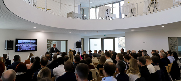 Der Leiter der ZfP-Abteilung Bau & Entwicklung, Nicolas Riek, und Stefan Popp vom Architekturbüro Broghammer-Jana-Wohlleber stellten die Chronologie, die beteiligten Partner und das Konzept des Bauprojekts vor. Riek beschrieb den wellenförmigen Projektverlauf, berichtete von den Corona-Einschränkungen, von bürokratischen Hürden wie dem 19-monatigen Warten auf die Baugenehmigung, und davon, dass zwischenzeitlich alles teurer wurde und etwa die volle Unterkellerung und der Gebäudeflügel für die staatliche Klinikschule dem Rotstift zum Opfer fielen: „Dieses Haus wurde für mich zu einem Herzensprojekt, auf das alle Beteiligten stolz sein können. Von der Ursprungsidee 2012 bis heute hat es zwar eine Weile gedauert, aber die Mühe hat sich gelohnt: Es ist modern und nachhaltig, clever konzipiert und perfekt positioniert.“ Architekt Popp ging anschließend auf die windmühlenartige Struktur des Gebäudes ein sowie auf die beiden zentralen Konzeptelemente Gliederung und Atmosphäre: „Die zentrale Eingangshalle mit Kletterwand soll ein Ort für Begegnung und Austausch sein. Gleichwohl gibt es Rückzugsorte – es ging uns um Geborgenheit ohne Einengung.“ Die gedeckte, nicht zu laute Farbgestaltung solle ebenso dazu beitragen wie die Verwendung von Holz. Und die großen Fensterflächen mit floralen Elementen sollen den Bezug zur Natur herstellen.
