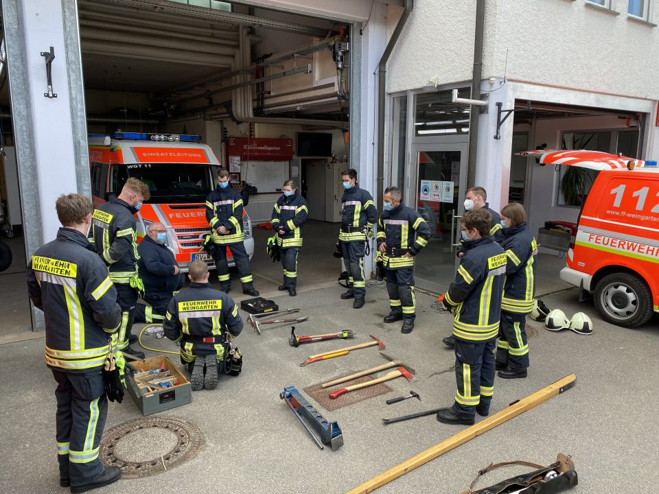 Im Anschluss an den Online-Unterricht galt es das gelernte in der Praxis umzusetzen. Hier wurde in Weingarten gewartet bis die 7-Tage-Inzidenz unter 100 gefallen und vom Innenministerium erlaubt wurde wieder Ausbildungen in Kleingruppen abzuhalten. So traf sich die kleine Ausbildungsgruppe mit ihren 9 Teilnehmern an drei Samstagen im Außenbereich der Feuerwache. Bevor jedoch geübt werden konnte, wurden alle Teilnehmer und Ausbilder mit einem Schnelltest getestet. Weiterhin wurde natürlich auf den nötigen Abstand geachtet und dort wo dieser nicht eingehalten werden konnte, musste mit Mund-Nasen-Schutz geübt werden. Verschiedenste Einsatzszenarien sowie Gerätekunde standen auf dem Plan. Von der technischen Hilfeleistung über das Ansaugen aus fließendem Gewässer bis hin zum Löschangriff mit Riegelstellung. Die „Neuen“ waren mit Begeisterung dabei und konnten ihr gelerntes Wissen schnell in die Tat umsetzen.