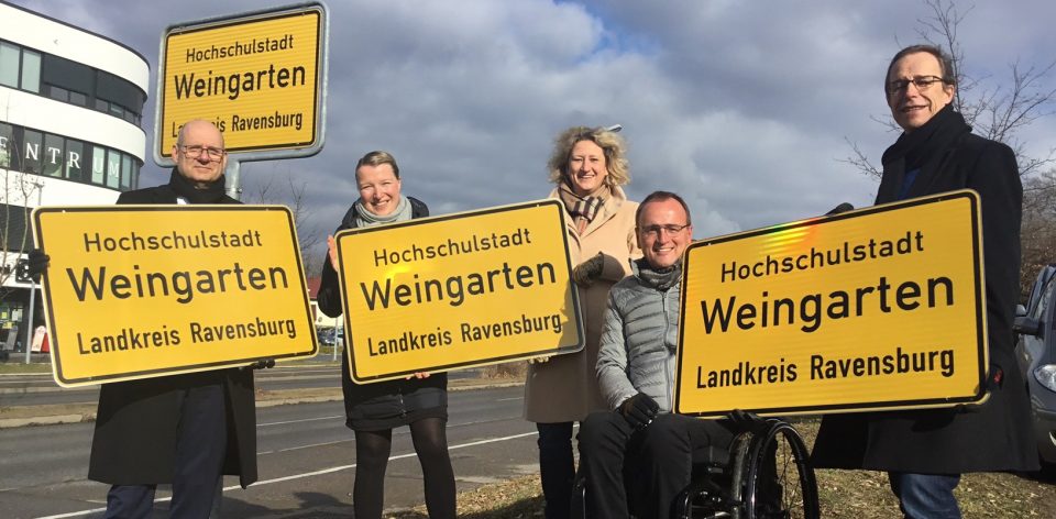 Weingarten konnte das Auswahlgremium des Innenministeriums überzeugen. Mitte Dezember verlieh Innenminister Thomas Strobl der Stadt offiziell die Zusatzbezeichnung „Hochschulstadt“. Das Team des städtischen Baubetriebshofs hat die dazugehörigen Ortsschilder nun am vergangenen Freitag an 19 Stellen im Stadtgebiet angebracht. Oberbürgermeister Markus Ewald (Stadt Weingarten), Rektor Prof. Dr. Thomas Spägele (RWU, links im Bild), Prorektor Prof. Dr. Bernd Reinhoffer (PH Weingarten) sowie die Fachbereichsleiterin Sylvia Burg und die zuständige Abteilungsleiterin Sabine Weisel (jeweils Stadt Weingarten) machten sich selbst ein Bild von der neuen Beschilderung.