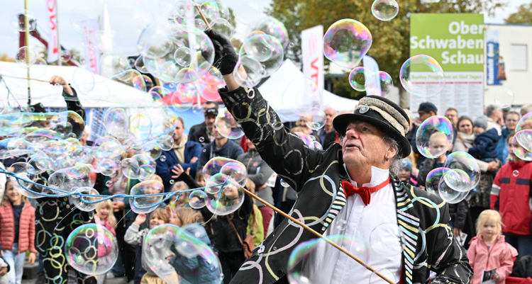 Was Besonderes wird der Familien-Tag am Sonntag, 19. Oktober: Dafür wird erstmals eine komplette Messehalle leergeräumt. Die Halle 14, direkt neben der Oberschwabenhalle – man wird sie am Messe-Sonntag vermutlich phasenweise recht gut hören können. Dort wird an diesem Tag nur gespielt und gelacht, gestaunt und geschmökert, gebastelt und geflochten: Zum „Tag der Familie“ gehören viele Programmpunkte und Angebote für Kinder und Eltern. Einen Mitmach-Zirkus beispielsweise (um 10.30 Uhr) und eine Seifenblasen-Show (um 13.13 Uhr) mit XXL-Seifenblasen. Beides macht Clown Klausi Klücklich mit seiner Partnerin Frohnella.
