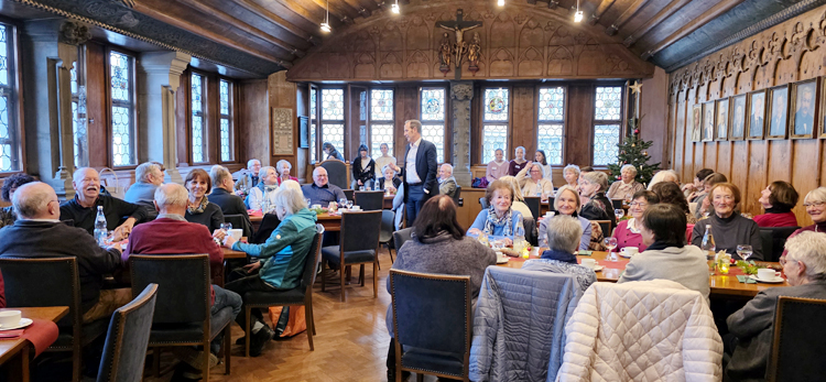 Rund 20 Jugendliche der Klassen 8a und 8b der Realschule Klösterle gestalteten am Mittwoch, 10. Dezember, mit ihren Lehrerinnen Desiree Mayr und Gina Wohlert die öffentliche Weihnachtsfeier im Rathaus. Nach der Begrüßung durch Oberbürgermeister Dr. Daniel Rapp begrüßte ein Moderationsteam der Schülerinnen die Gäste. Im Anschluss wurden die ersten Adventslieder gesungen, schwungvoll begleitet von Schulleiter Patrick Maier am Piano, das von der Musikschule Ravensburg zur Verfügung gestellt wurde. Ein besinnliches Theaterstück der Schülerinnen regte im Nachklang zum Nachdenken an. Beim Kaffeetrinken ließen sich die 50 Teilnehmenden im ausgebuchten, festlich von den Schülerinnen dekorierten Saal, die leckeren Kuchen und Torten sowie Gebäck und Lebkuchen schmecken. Diese wurden von den Bäckereien Hamma und Mayer, vom Bauernmarkt, dem Café und Imbiss B33 sowie der Konditorei Weber & Weiss gespendet, was mit einem großen Applaus honoriert wurde.