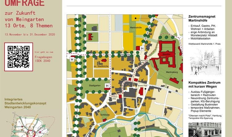 Seit Freitag den 13. November, findet die Online-Beteiligung zum Integrierten Stadtentwicklungskonzept Weingarten 2040 (ISEK 2040) statt. Unter der Internetadresse www.weingarten.online.de/isek2040 ist der Entwurf des Masterplanes, des Handlungskonzepts sowie der bisherige Planungsstand dargestellt und erläutert.