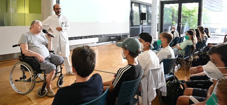 Nach zwei Jahren Coronapause dürfen 70 Siebtklässler des Albert-Einstein-Gymnasium die zweite Premiere der Veranstaltung miterleben. Sie seien gerade in dem Alter, in dem viele zum ersten Mal zur Zigarette greifen, sagt Prof. Dr. Florian Seeger, Chefarzt der Kardiologie am EK. Gemeinsam mit Dr. Dominik Jost, dem Chefarzt der Klinik für Gefäßchirurgie, macht er auf die gravierenden Folgen des Tabakkonsums für die Blutgefäße und damit auch für die Durchblutung des Herzens aufmerksam. „Wie bei einem verkalkten Wasserrohr können unsere Arterien sich durch Ablagerungen verengen“, erklärt der Mediziner. „Die Folge kann ein Herzinfarkt sein, der tödlich endet, wenn man nicht blitzschnell reagiert.“ Ein beträchtlicher Anteil der Herzinfarktpatienten versterbe noch heute innerhalb eines Jahres, wissen die Kardiologen bei der OSK. Und selbst wenn nicht, seien Patienten nach einem Herzinfarkt ein Leben lang eingeschränkt.