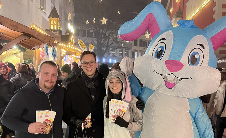 Mit einer ungewöhnlichen Aktion sorgten die Jungen Liberalen Ravensburg–Bodensee am Donnerstag, den 18. Dezember, am Rande des Ravensburger Weihnachtsmarktes für Aufmerksamkeit. Unter dem Motto „Heute schon an morgen denken“ machten sie – als Osterhasen verkleidet – auf die langfristigen Folgen politischer Entscheidungen aufmerksam.