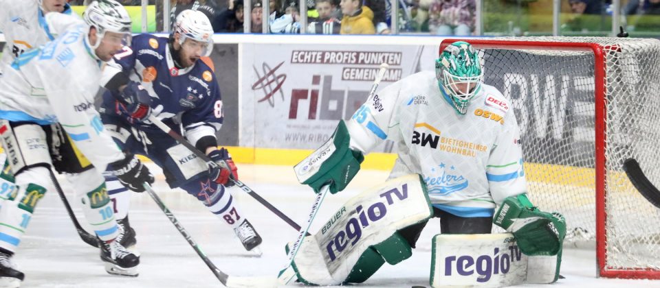 In Sachen Torchancen waren die Oberschwaben im Schlussdrittel wieder deutlicher vorne als in den zweiten 20 Minuten, vor dem gegnerischen Tor blieb die Lage allerdings wie verhext. Beispielsweise hatte Kapitän Sam Herr gleich zweimal das weit offene Bietigheimer Tor vor Augen, der Ausgleich wollte jedoch nicht fallen. Die bedrohlich schnell heruntertickende Spielzeit blieb auch den Fans in der mit 2919 Zuschauern ansprechend gefüllten CHG Arena nicht verborgen. Sie peitschten das Team jetzt noch mehr nach vorne, letztlich mit Erfolg. Sam Herr tankte sich viereinhalb Minuten vor Ende der regulären Spielzeit über die rechte Seite durch die Steelers-Zone, bediente den im Slot vom Gegner unbemerkt mitgelaufenen Verteidiger Denis Pfaffengut und der schob konsequent zum erlösenden 1:1-Ausgleich ein.