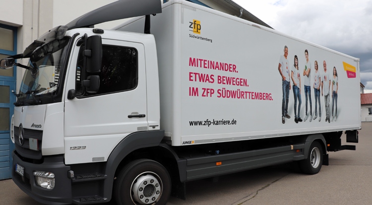 Schon entdeckt? Die LKWs der Wirtschaftsabteilung des ZfP Südwürttemberg wurden mit Motiven aus der Arbeitgeberkampagne sowie mit Werbung für die Serviceangebote der Wirtschaftsabteilung beklebt. Auf den Längsseiten der bis zu sieben Meter langen Auflieger sind unterschiedliche großflächige Motive zu sehen.