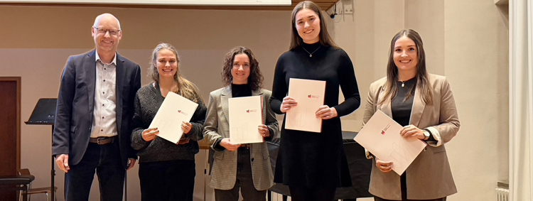 den VdF-Preisen wurden die PH-Absolventinnen Miriam Moll, Hannah Ahlbrecht, Katharina Regner, Mareike Heiner (nicht im Bild) und Inanna Rollinger ausgezeichnet. Es gratulierte ihnen VdF-Geschäftsführer Prof. Dr. Andreas Schwab. Bild: Benjamin Frick