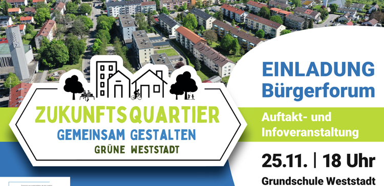 Die Stadt Ravensburg lädt alle interessierten Bürgerinnen und Bürger herzlich ein, die Zukunft des Sanierungsgebiets Grüne Weststadt aktiv mitzugestalten. Unter dem Motto Mitreden, Mitgestalten, Mitwirken startet am Dienstag, 25. November, um 18 Uhr in der Mensa der Grundschule Weststadt der Beteiligungsprozess zum „Zukunftsquartier Grüne Weststadt“.