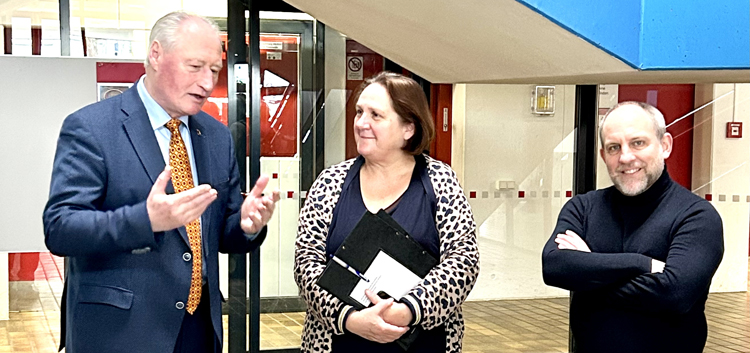 Bei den drei kommunalen Gymnasien gab es einen Rundgang über das „Welfen“ zum „Spohn“ und „Albert-Einstein“ mit Einblicken in die verschiedenen Profile. Das Spohn-Gebäude wurde über mehrere Jahre für 21 Millionen Euro grundsaniert, davon kamen 6 Millionen Euro vom Land aus dem Programm für historische Schulen. Die Rektorinnen Susanne Lutz (geschäftsführende Schulleiterin der Gymnasien, Spohn), Annette Brunke-Kullik (AEG), Rektor Tilmann Siebert (Welfen) und Amtsleiter Dieter Katein (Architektur und Gebäudemanagement) stellten die erfolgreiche Sanierung der Gebäude und der Schul- und Fachräume vor. Die bildungspolitische Fragerunde in der Spohnmensa mit Teilnehmenden aus den Kollegien, der Schüler- und Elternschaft sowie von Rektorin Michaela Steinhilber (Realschule) wurde souverän von Rektorin Susanne Lutz moderiert. Kultusministerin Theresa Schopper stellte sich den Fragen etwa zur Unterrichtsversorgung, zu den wachsenden Verwaltungsaufgaben, zu Corona-Lernrückständen, zur digitalen Ausstattung, zur Überlastung der SchülerInnen und zur G 8/G 9-Debatte. Ministerin Theresa Schopper: „Über 50 % der Abiturientinnen und Abiturienten absolvieren ein G 9-Fachgymnasium. Das ist eine Besonderheit in Baden-Württemberg im Vergleich zu den anderen Bundesländern. Eine Änderung an den G 8-Gymnasien ist im Koalitionsvertrag nicht vorgesehen.“