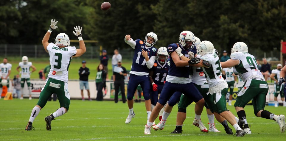 Auch wenn Hall nach eigener Aussage im Voraus auf einige Stammspieler verzichten wollte, bot der Kader der Unicorns dann doch fast die komplette Tiefe. Entsprechend galten die Haller als klarer Favorit. Dass sie dieser Rolle gerecht werden wollten, zeigten die Unicorns gleich von Beginn an und gingen früh durch Aurieus Minton – vor knapp 900 Fans im Lindenhofstadion.- in Führung. Trotz einiger guter Spielzüge der Ravensburger und damit verbundener First Downs konnten die Oberschwaben zunächst nicht punkten.