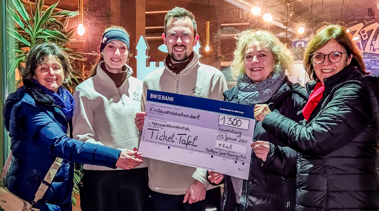 Am 13. Dezember 2025 gab es einen 60-Kilometer-Spendenlauf des RedRave Social Running Clubs zu Gunsten der Ticket-Tafel der Stadt Ravensburg. Rund 100 Personen schlossen sich dem Lauf zwischen 11 und 20 Uhr an und spendeten zugleich zusammen 1.300 Euro für die Ticket-Tafel bei der Freiwilligenagentur der Stadt Ravensburg. Registrierte Gäste mit kleinem Geldbeutel erhalten über die Ticket-Tafel kostenlose Eintrittskarten, die von Veranstaltern in Ravensburg großzügig gespendet werden. Mit den Spendengeldern können weitere Tickets für besondere Anlässe erworben werden. Bei der Spendenübergabe bedankten sich die Ehrenamtlichen des Ticket-Tafel-Teams zusammen mit der Leiterin der Freiwilligenagentur Sophie Bader bei den Initiatoren.