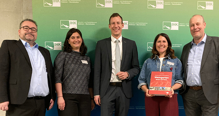 Oberbürgermeister Clemens Moll (Mitte) und Wirtschaftsförderin Luisa Gaa (links) mit den Referenten des diesjährigen Wirtschaftsgesprächs. Bild: Stadt Weingarten