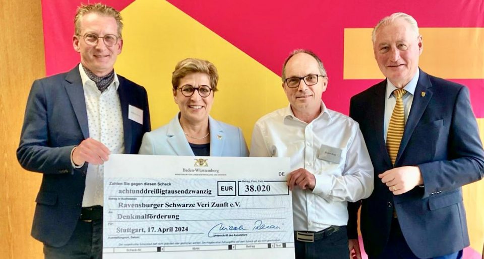 Die Schwarze-Veri-Zunft e.V. in Ravensburg erhält einen Zuschuss von 38.000 Euro für die Sanierung von Fassade und Dach ihres Vereinsheims, dem historischen Wernerhof“, freut sich der CDU-Abgeordnete August Schuler. Am Mittwoch konnten Zunftmeister Jürgen Breg und Vize-Zunftmeisterin Andreas Denda als Vertreter der Schwarze Veri Zunft im Stuttgarter Landtag den symbolischen Scheck aus den Händen der Ministerin für Landesentwicklung und Wohnen Nicole Razavi MdL in Empfang nehmen.