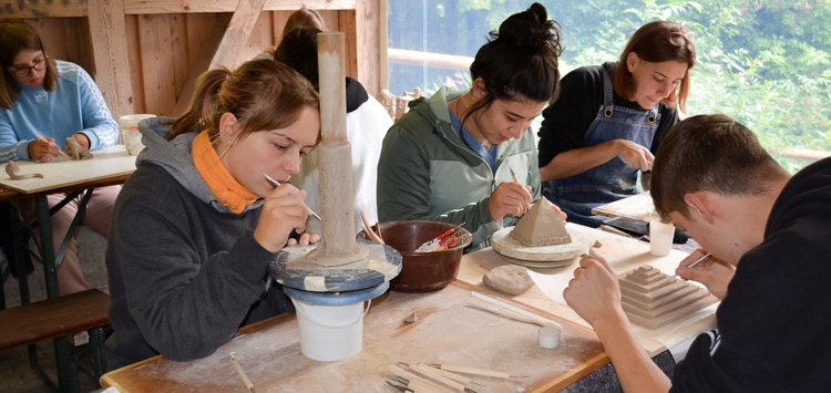 Fleißig gearbeitet wird auch in dem Workshop „Lebendiger Ton“. Schon sind die ersten Kreationen, darunter Gebäude, Türme und futuristische Bauwerke, zu sehen. „Wir haben uns zunächst mit den Grundlagen der Tonbearbeitung auseinandergesetzt“, berichten die Teilnehmenden. Jetzt lassen sie ihrer Kreativität freien Raum. Gemeinsam wollen sie eine kleine Patchwork-Stadt aus Ton erschaffen. Dass ihnen dies gelingen wird, ist klar erkennbar.