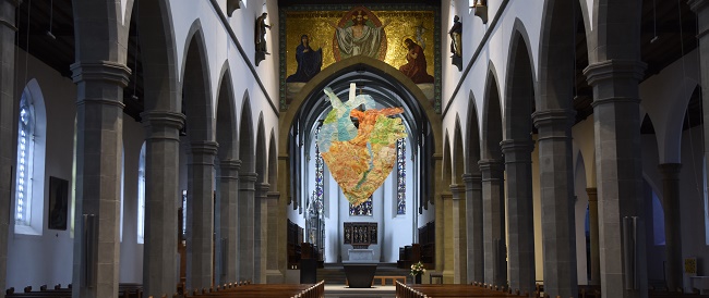Seit Aschermittwoch ist das große Kreuz im Chorbogen der Liebfrauenkirche hinter einem überdimensionalen Herz verschwunden. Das anatomische geformte Herz ist in seinen einzelnen Teilen aus Landkarten zusammengesetzt. Mit dem großflächigen Kunstwerk greifen Schülerinnen des Kunstprofils am Welfen-Gymnasium bereits zum neunten Mal das Motto der Fastenpredigtreihe auf: „Heimat-Los“. Sie haben das übersetzt in Anlehnung an den Song von Elvis Presley „Home is where the heart is“ – zu Deutsch: „Heimat ist dort, wo dein Herz ist“.