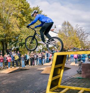Die 106 Radelnden des Progymnasiums in Altshausen sammelten innerhalb des Aktionszeitraums über 16.870 Kilometer. Das sind durchschnittlich 159 Kilometer pro Kopf. Der Gewinn – ein abwechslungsreiches Fahrrad-Festival für die ganze Schule – begeisterte am Donnerstagnachmittag Groß und Klein: Die Schülerinnen und Schülern lernten von einem BMX-Profi verschiedene Tricks auf dem Rad, die sie anschließend auf einem Pumptrack ausprobieren konnten. Eine Maultaschen-Rikscha versorgte die Kinder und Jugendlichen mit einem leckeren Mittagessen, sie konnten Energie für ihre Schule mit einem Fahrrad erzeugen, an einem Geschicklichkeits-Parcours bei der Verkehrswacht teilnehmen, durch die Fahrradwaschanlage fahren und es sich an der Popcorn- Maschine schmecken lassen. Die lokale Polizei half dabei, Fahrradhelme richtig einzustellen und die Sichtbarkeit der Kinder und Jugendlichen zu erhöhen. Die Verkehrswacht organisierte einen Geschicklichkeitsparcours.