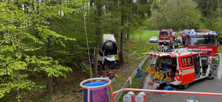 Die Alarmierung erfolgte durch die LeitstelleBodensee-Oberschwaben für den Rüstzug der Feuerwehr Weingarten zur Unterstützung der Feuerwehr Schlier. Einsatzstichwort: „Verkehrsunfall mit eingeklemmter Person.“ Ein Kleintransporter kam in einer Kurve von Unterankenreute Richtung Weingarten von der Fahrbahn ab. Der Wagen prallte gegen einen Baum und fing sofort Feuer. Ersthelfer versuchten den eingeklemmten jungen Mann zu befreien, jedoch mussten Sie sich durch die Flammen selbst in Sicherheit bringen.