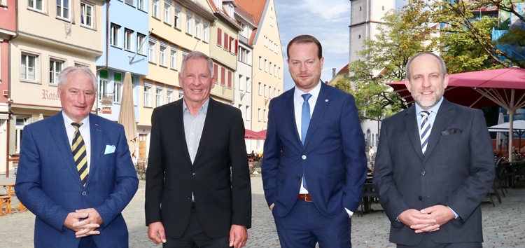 Begrüßung auf dem Marienplatz: Erster Bürgermeister Simon Blümcke (von rechts), Kreisvorsitzender Christian Natterer MdB und Stadtverbandsvorsitzender August Schuler MdL begrüßen Zeitzeuge Lothar Schulz, der zum „Tag der Deutschen Einheit“ aus Berlin angereist kam. Foto: Siegfried Heiss