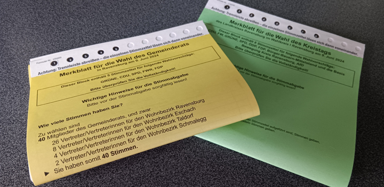 Die Stadt Ravensburg hat die Wahlbenachrichtigungen für die Wahlberechtigten für die Europawahl und die Kommunalwahlen bereits verschickt. Viele Wahlberechtigte haben daraufhin bereits die Briefwahlunterlagen beantragt und nun mit diesen Unterlagen die Stimmzettel für die Wahlen erhalten. Zusätzlich hat das Wahlamt der Stadt die Stimmzettel für die Wahlen des Gemeinderats, der Ortschaftsräte sowie des Kreistags verschickt, damit alle Wahlberechtigten in Ruhe zu Hause Zeit für die Verteilung ihrer Stimmen haben.