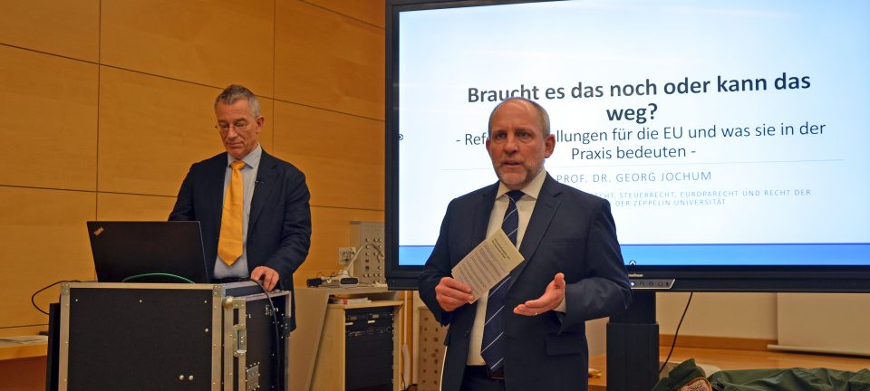 Im Anschluss an die Wahlen referierte Prof. Georg Jochum über die Reformvorstellungen der Parteien. Von wirklich mehr Europa bis hin zum Abriss der Europäischen Union und deutschen Sonderwegen reichen die Vorstellungen, so der Experte in seinem spannenden Vortrag. Insbesondere die Phantasien eines „Dexit“ – also dem deutschen Austritt aus der EU – betrachtete Kreisvorsitzender Blümcke in seinem Schlusswort sehr kritisch und schlug einen Bogen vom „weit entfernten“ Europa zum Bodensee: „Unsere Region und insbesondere Friedrichshafen und Ravensburg leben vom Export und freien Märkten – diese gibt es nur mit der EU. Das Faseln von Austritt und Rückbau der EU ist brandgefährlich für unseren Wohlstand vor Ort“, so Blümcke. Nicht zuletzt erinnerte er an das Friedensprojekt EU – neben den Lehren aus zwei Weltkriegen gelte es, Europa auch als Raum der Freiheit und Sicherheit in einer von zunehmenden Unsicherheiten geprägten Welt zu sehen und vor allem zu entwickeln.