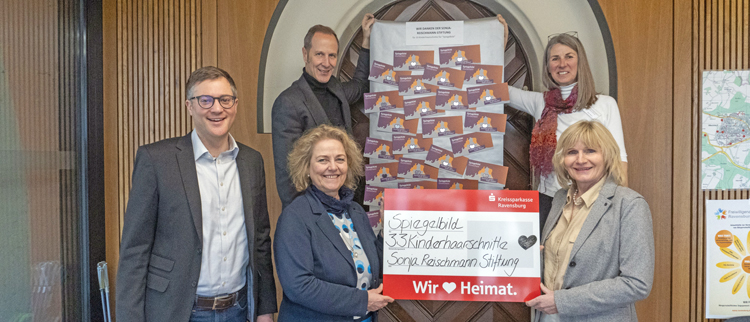 m Rahmen ihrer monatlichen Jubiläumsaktionen überreichte Sabine Reischmann im Namen der Sonja-Reischmann-Stiftung 33 Kinderhaarschnitte für das Projekt „Spiegelbild“. Spiegelbild ist ein Partnerprojekt der „Ticket-Tafel“ bei der Freiwilligenagentur der Stadt Ravensburg.