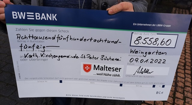 Am 9. Januar hatten die Kinder und Jugendlichen der katholischen Pfarrei St. Peter in Trier-Ehrang allen  Grund zu strahlen. An diesem Tag überreichten die Malteser aus Ravensburg/Weingarten im Rahmen eines Gottesdienstes einen Spendenscheck in Höhe von 8.558,60 Euro und ein Spendenpaket der Ravensburger AG mit Kinderbüchern, Gesellschaftsspielen und Puzzles.