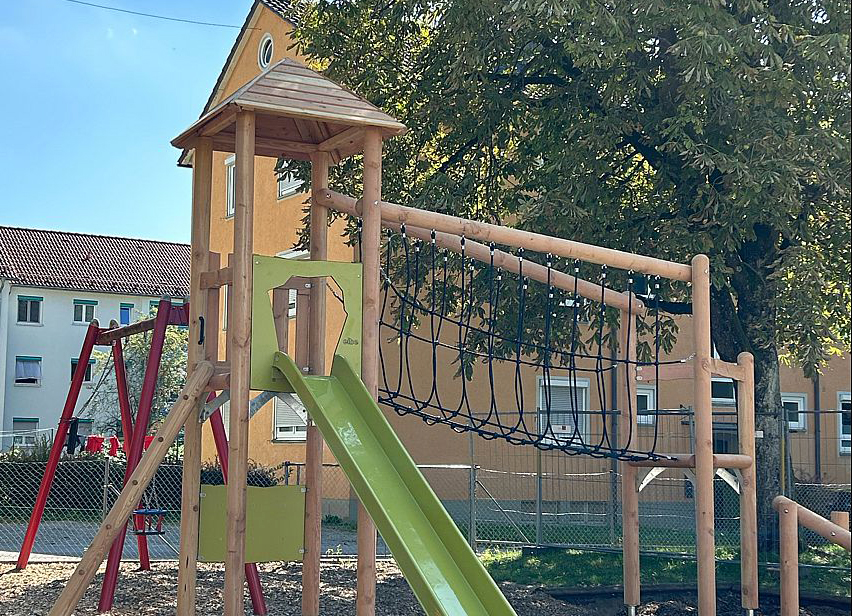 Drei neue, hochwertige Spielgeräte machen den Spielplatz in der Blumenau zu einem kleinen Schmuckstück: ein Kletter- und Geschicklichkeitsturm mit grüner Rutsche, eine Sandbaustelle mit Eimer-Aufzug und ein Holzspielhäuschen mit Fenstern. Die Sitze der beiden Wipptiere wurden ausgetauscht, die alte Rutsche und die Schaukel sind gut erhalten und an ihrem Platz geblieben. Der frisch gesäte Rasen ist inzwischen angewachsen, und nun fehlen nur noch neue Hecken und Sträucher.