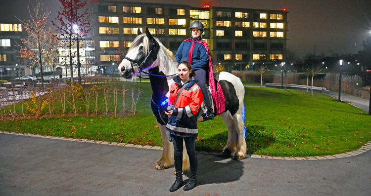 Gemeinsam mit dem 8-jährigen Tinker Wallach namens Nemo, der festlich beleuchtet war, und in Begleitung von Marina Hehle von der Sanitätsreiterstaffel, drehte sie einige Runden um den Teich vor dem Klinikum und bis zum Südeingang. So konnte der Lichterritt auch besonders gut von den Patienten der Klinik für Kinder- und Jugendliche mitverfolgt werden.