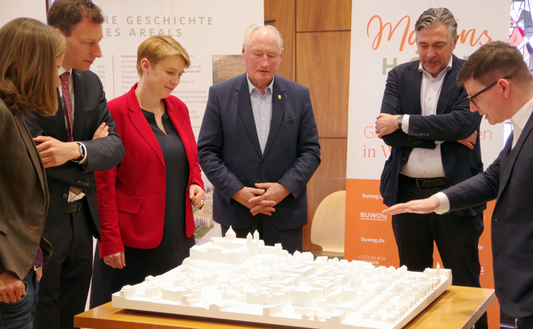 „Wir fanden ein sehr gut strukturiertes und fertiges Projekt mit sehr durchdachtem Bebauungsplan sowie detailliertem städtebaulichen Vertrag vor“, führte der Geschäftsführer der BUWOG Deutschland und Österreich, Andreas Holler, aus. Der verantwortliche Projektleiter der BUWOG, Roman Steindl, schilderte anschaulich die fachliche Herausforderung, aus einem ehemaligen Industriestandort mit meterdicker, versiegelter Fläche ein lebenswertes und nachhaltiges Wohnquartier zu entwickeln. Auch die derzeit wirtschaftlichen und finanzpolitischen widrigen Rahmenbedingungen stellen die BUWOG vor Herausforderungen: „Wir haben das Projekt mit der Intention übernommen, attraktiven und bezahlbaren Wohnraum zu entwickeln“, so Holler. „Derzeit agieren wir unter erschwerten Rahmenbedingungen und sind hier mitunter auf verlässliche Fördervoraussetzungen, aber auch ein Stück weit auf das Verständnis der Stadt angewiesen“, so Holler weiter. Vor dem Hintergrund aktuell laufender Kostenoptimierungen plane man das Projekt aber, laut Holler, weiterhin zum vereinbarten Termin fertigzustellen. Die Baugenehmigungen für die ersten Bauabschnitte A+B lägen dem Investor bereits vor. Derzeit befinde man sich in der Ausarbeitung der Leistungsphase 5 sowie in der Angebotsprüfung potenzieller Generalunternehmer. Beim zweiten Bauabschnitt, der Baufelder F+G, befinde man sich aktuell in der Überarbeitung der Leistungsphase 2 und 3 sowie in der Einarbeitung und Abstimmung der Mieteranforderungen. Voraussichtlich noch in diesem Jahr plane man, den Bauantrag für diese zweite Bauetappe zu stellen. Sobald diese Prozesse abgeschlossen seien, würden laut Geschäftsführer die Planungen des dritten und vierten Bauabschnitts wieder aufgenommen werden.
