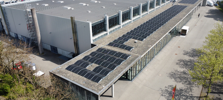 Das Foyer-Dach der Oberschwabenhalle ist mit Photovoltaik-Modulen bestückt worden. Mit insgesamt 388 Modulen auf einer Fläche von rund 760 Quadratmetern kann die Anlage künftig bis zu 164,9 kWp Strom produzieren. Das entspricht etwa 30 Prozent des Eigenbedarfs an Strom der Oberschwabenhalle. Dadurch verringert sich der jährliche CO2-Ausstoß um rund 80 Tonnen. Das Projekt ist eine Kooperation von Stadt Ravensburg und Technische Werke Schussental (TWS).