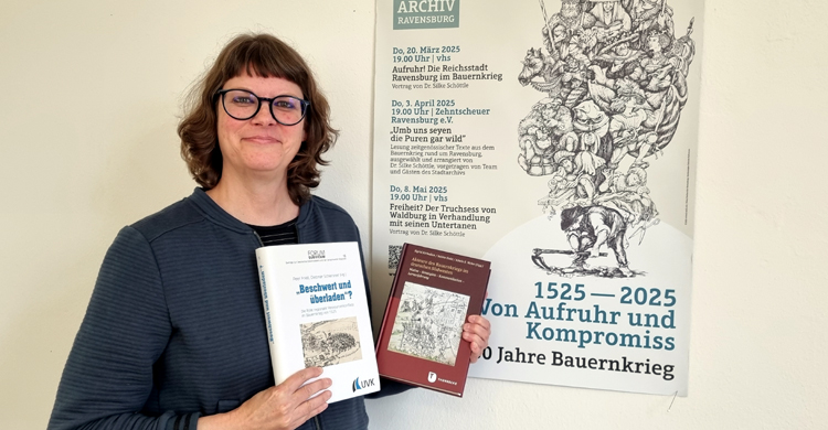 Der Beitrag zur Rolle der Reichsstadt Ravensburg im Bauernkrieg ist im Mai 2025 als Aufsatz in dem Sammelband „Akteure des Bauernkriegs im deutschen Südwesten“ erschienen. Herausgegeben von der Kommission für geschichtliche Landeskunde in Baden-Württemberg, ist das Buch gleichzeitig offizieller Begleitband zur Großen Landesausstellung in Bad Schussenried. Ein weiterer Artikel von Dr. Silke Schöttle mit umfangreichen Quelleneditionen zur Geschichte des Bauernkriegs in der Herrschaft Georgs III. von Waldburg erschien bereits im Herbst 2024 in dem Sammelband des Memminger Forums für schwäbische Regionalgeschichte „Beschwert und überladen“? Die Rolle regionaler Ressourcenkonflikte im Bauernkrieg von 1525. Beide Publikationen sind im Buchhandel erhältlich oder können in der Präsenzbibliothek des Stadtarchivs eingesehen werden.