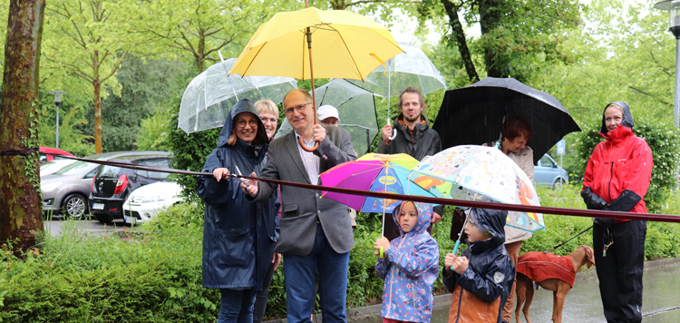 Prof. Dr. Juan Valdés-Stauber und Evelyne Stumpp ließen sich vom Regenwetter nicht beeindrucken und eröffneten am Weltnichtrauchertag feierlich den dritten Tabakwanderpfad auf dem Weissenauer Klinikgelände. Bild: Heike Amann-Störk
